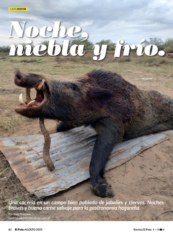 CAZA MAYOR Noche, niebla y frío. Una cacería en un campo bien poblado de jabalíes y ciervos. Noches bravas y buena carne salvaje para la gastronomía hogareña. Por Luis Frixione luisfrixione1922@yahoo.com.ar 82 AGOSTO 2025 Revista El Pato